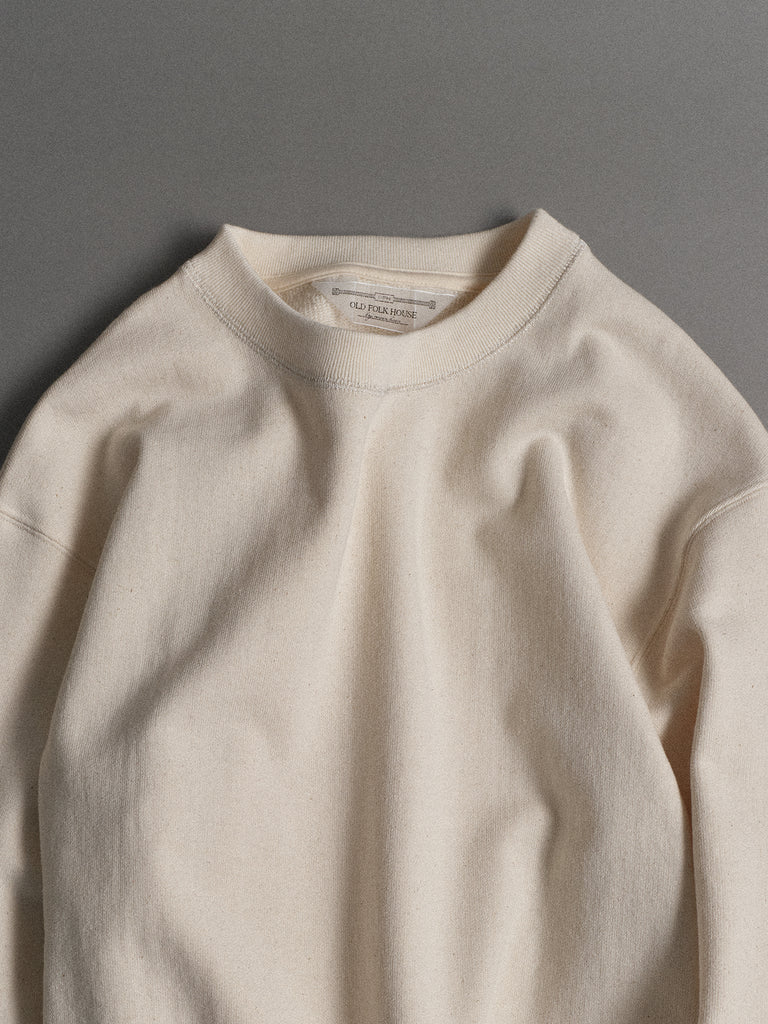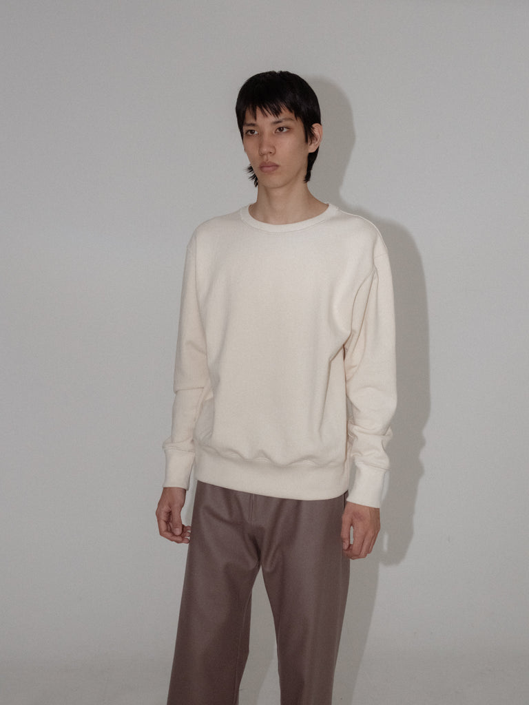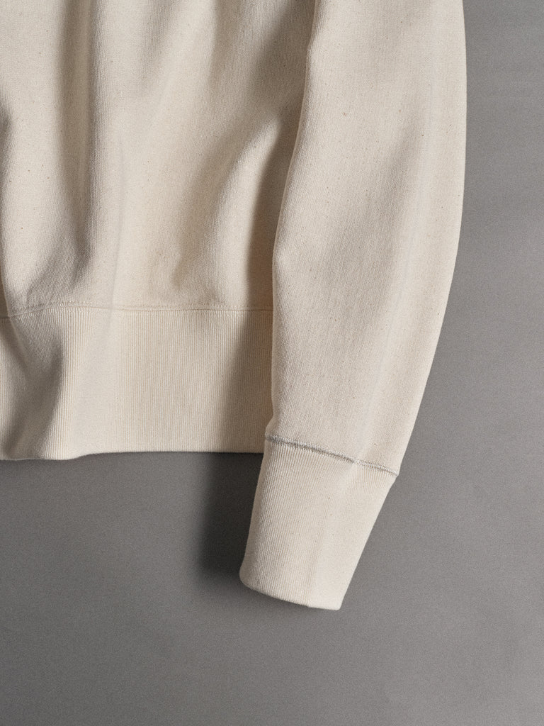 生地は紡績から編み、加工までを一貫して国内で生産された肉厚の裏パイル。表糸に熟成コットン原料を特殊紡績した糸を用いることで、独特なドライタッチと立体感のある表情が特徴です。