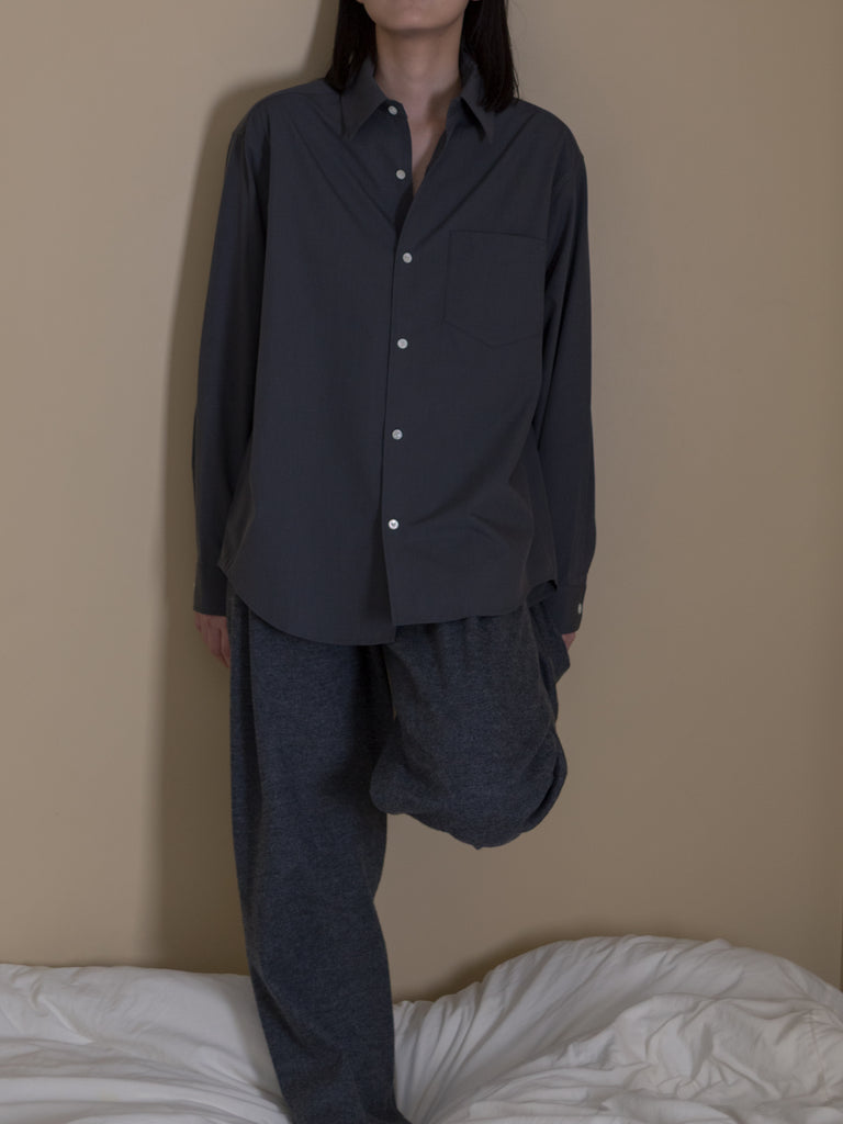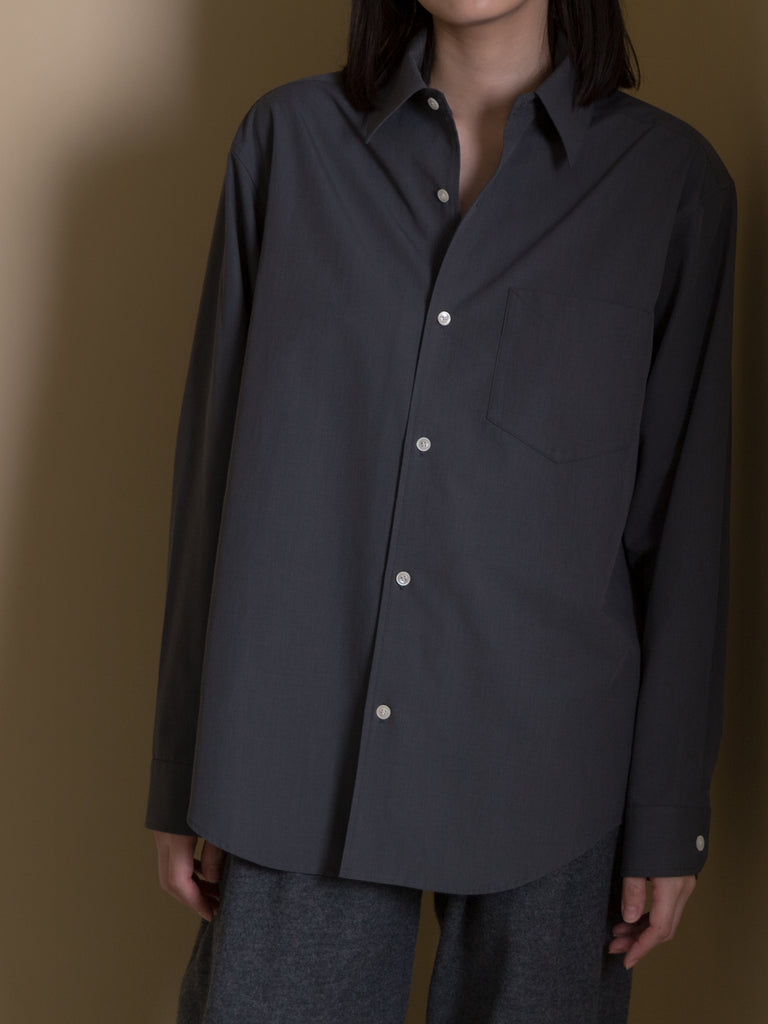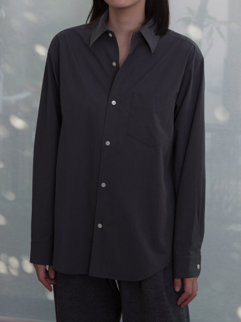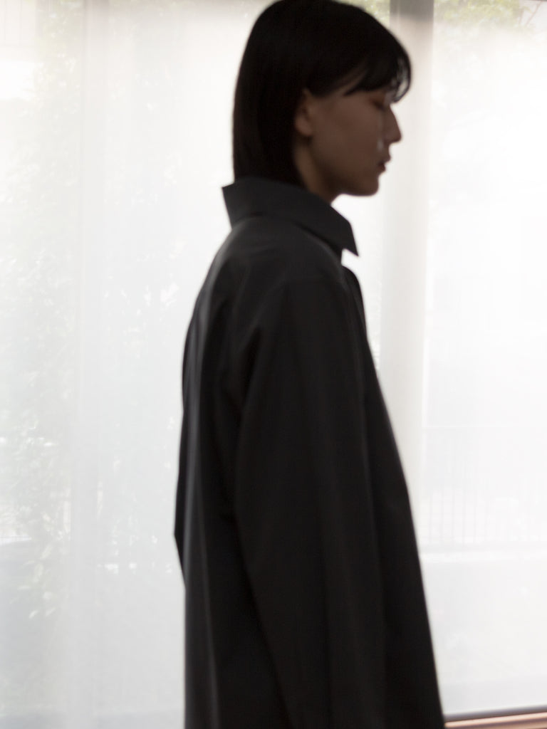 A high-density weather cloth woven from a blend of organic cotton and cupro. Features a slightly oversized, classic collar and a relaxed, well-balanced silhouette. Finished with a French front and piped cuffs.